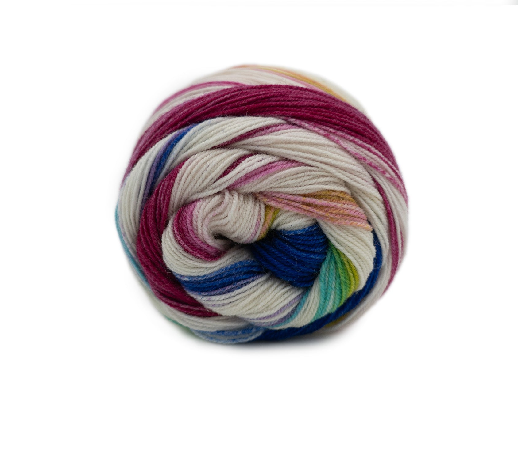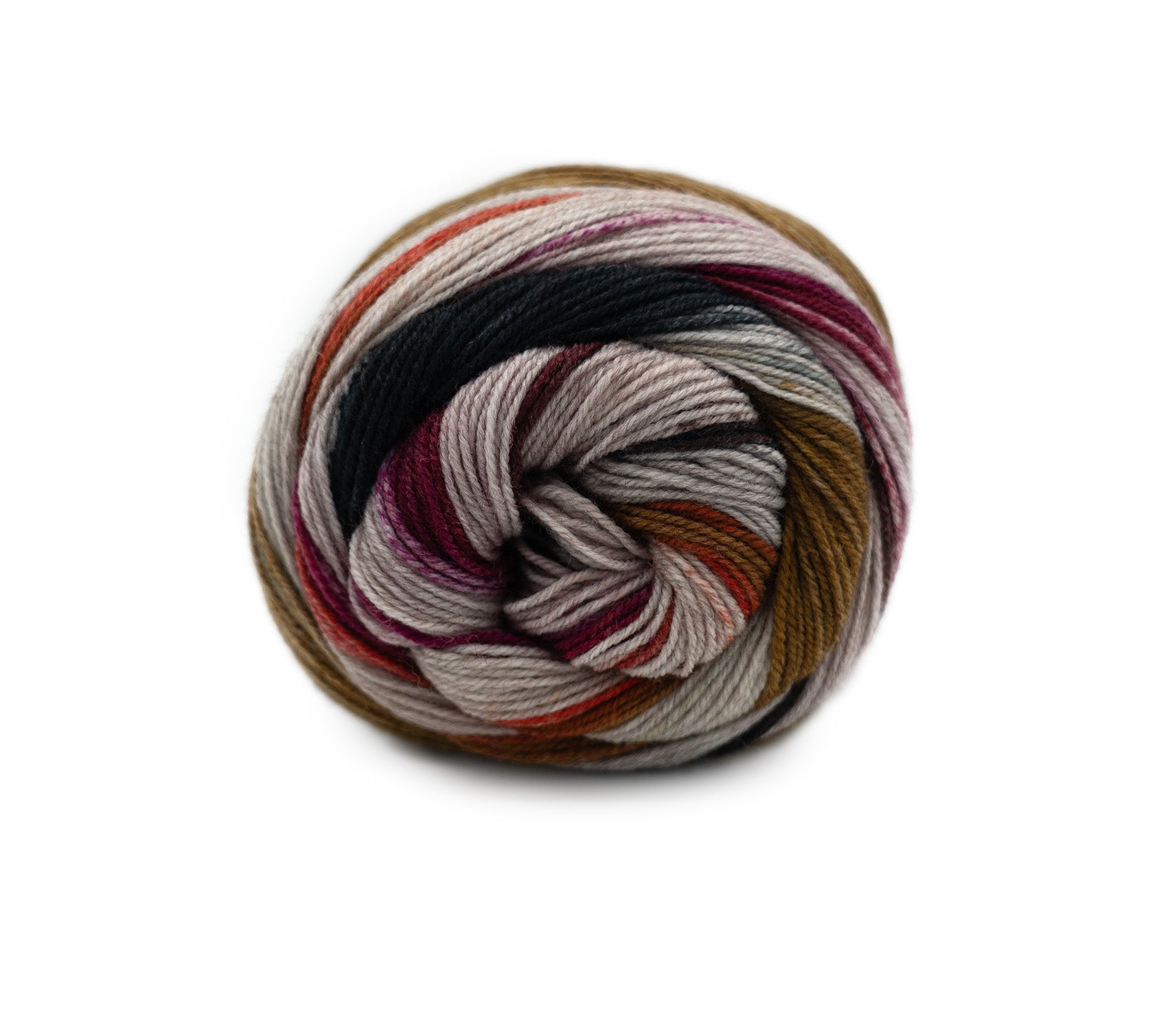 This yarn features an original print design, making sock knitting a unique experience. Each project tells a story full of vibrant colors, lively combinations, and dynamic designs. The Perfection Loop method allows you to knit two identical socks, ensuring the pattern remains consistent every time. Ideal for creative projects like scarves, hats, and sweaters in unique color combinations.