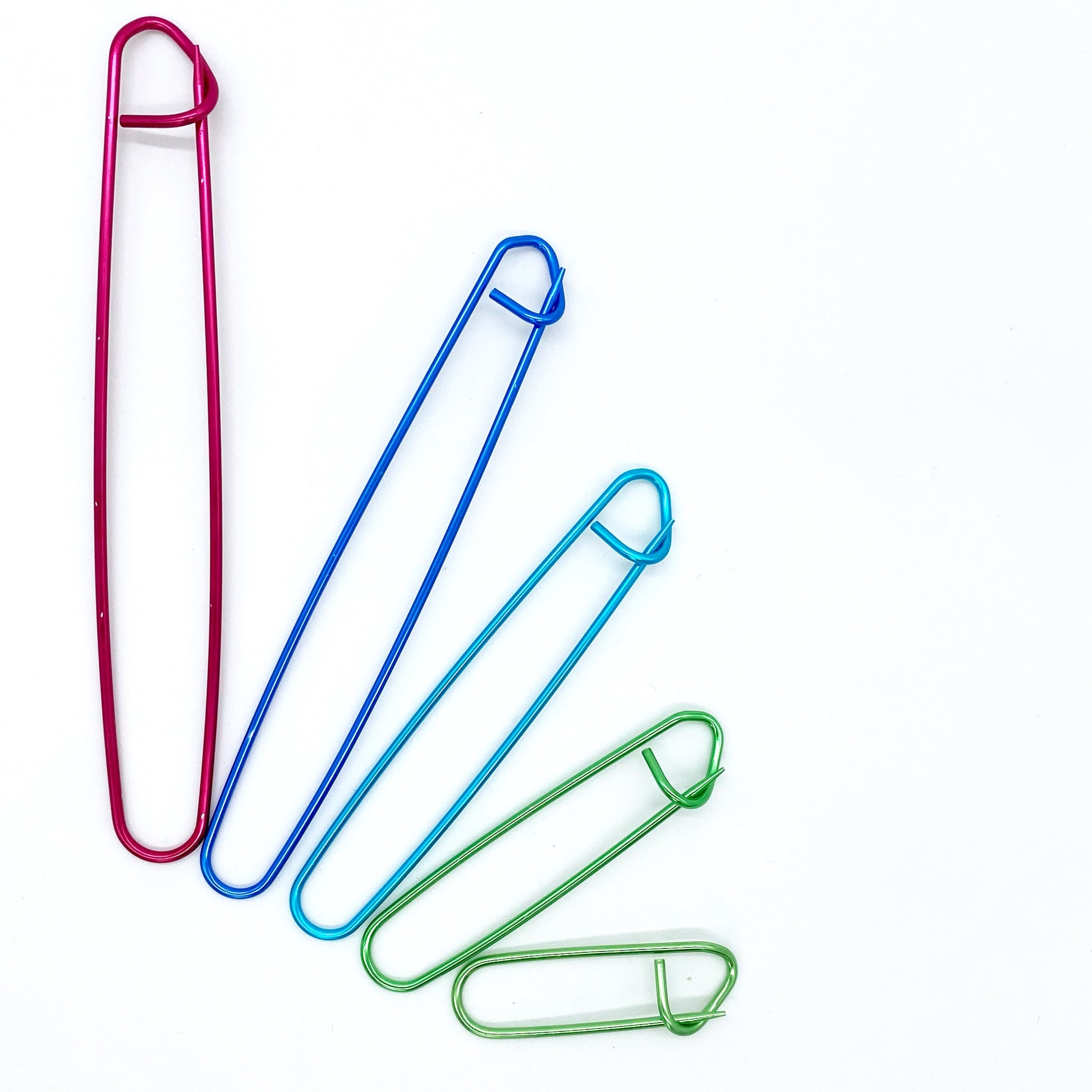 Sturdy aluminum stitch holders to securely hold inactive stitches. Our stitch holders come in five different options: 16 cm in red, 15 cm in blue, 12 cm in turquoise, 9 cm in green, and 6 cm in green. They prevent stitches from dropping or unraveling.