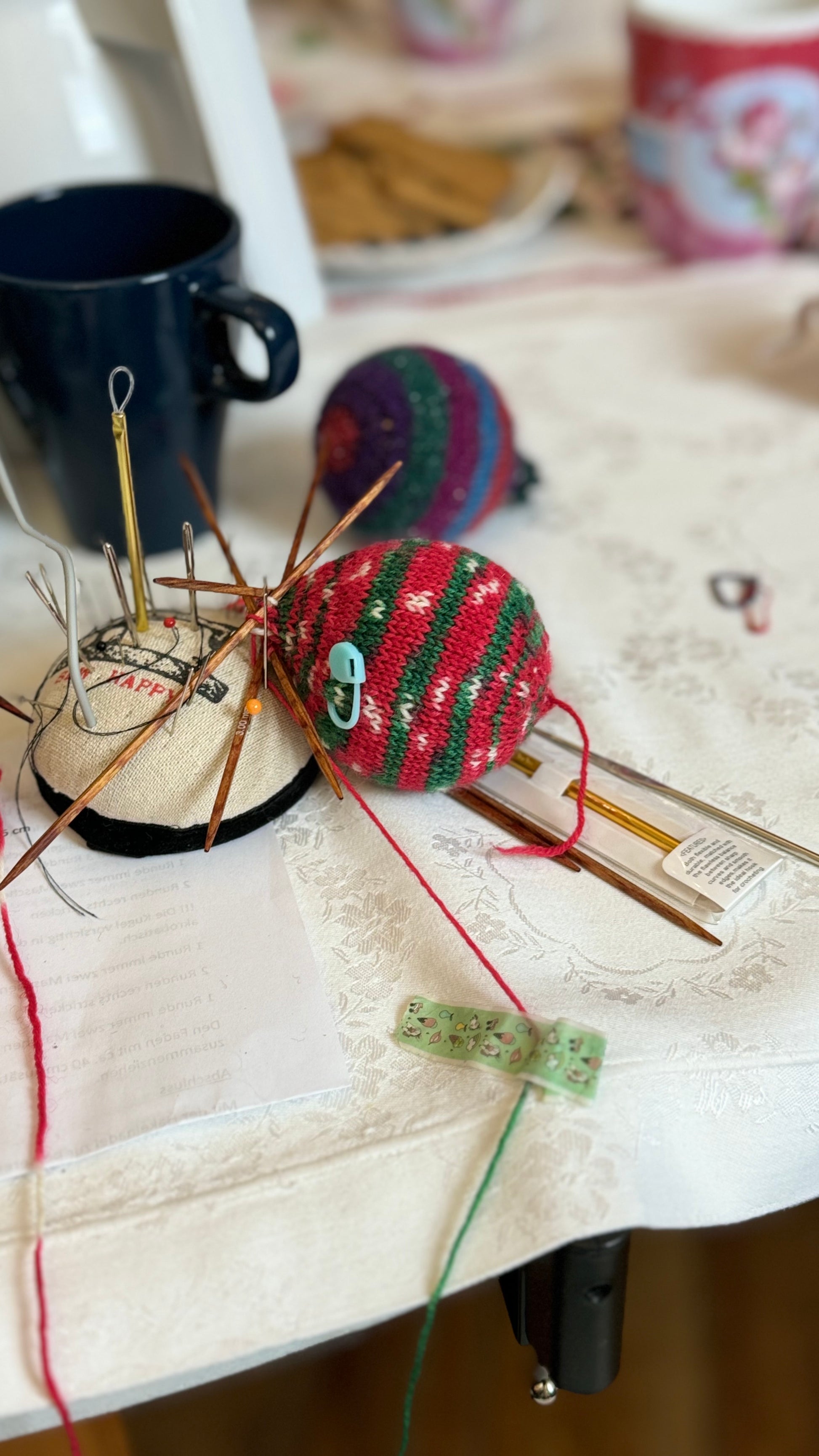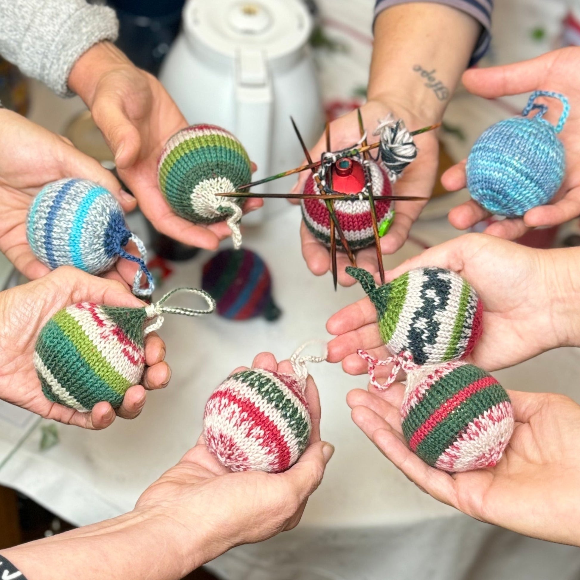 Jeder Teilnehmer erhält eine alte Weihnachtskugel aus Plastik, die während des Kurses umstrickt wird. Am Ende des Workshops bekommst du eine kleine schriftliche Anleitung, damit du das Projekt auch zu Hause fortsetzen kannst.