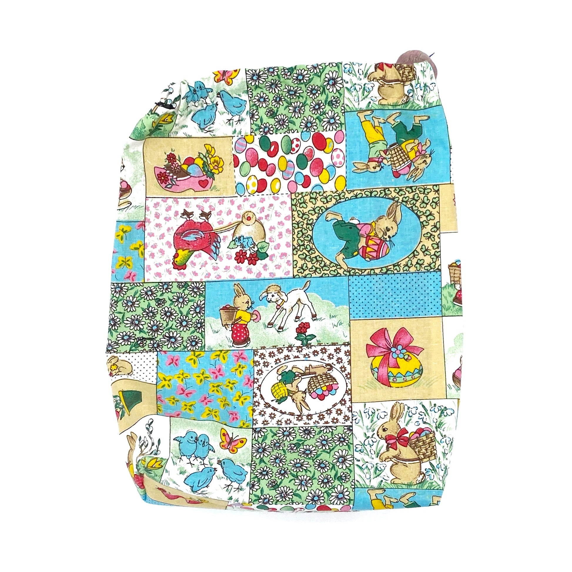 Diese süße und zugleich praktische Projekttasche mit Kordelzug und einem handgefertigten Stopper, einzigartigen Illustration von Osterhasen ist aus 100 % Baumwolle gefertigt.