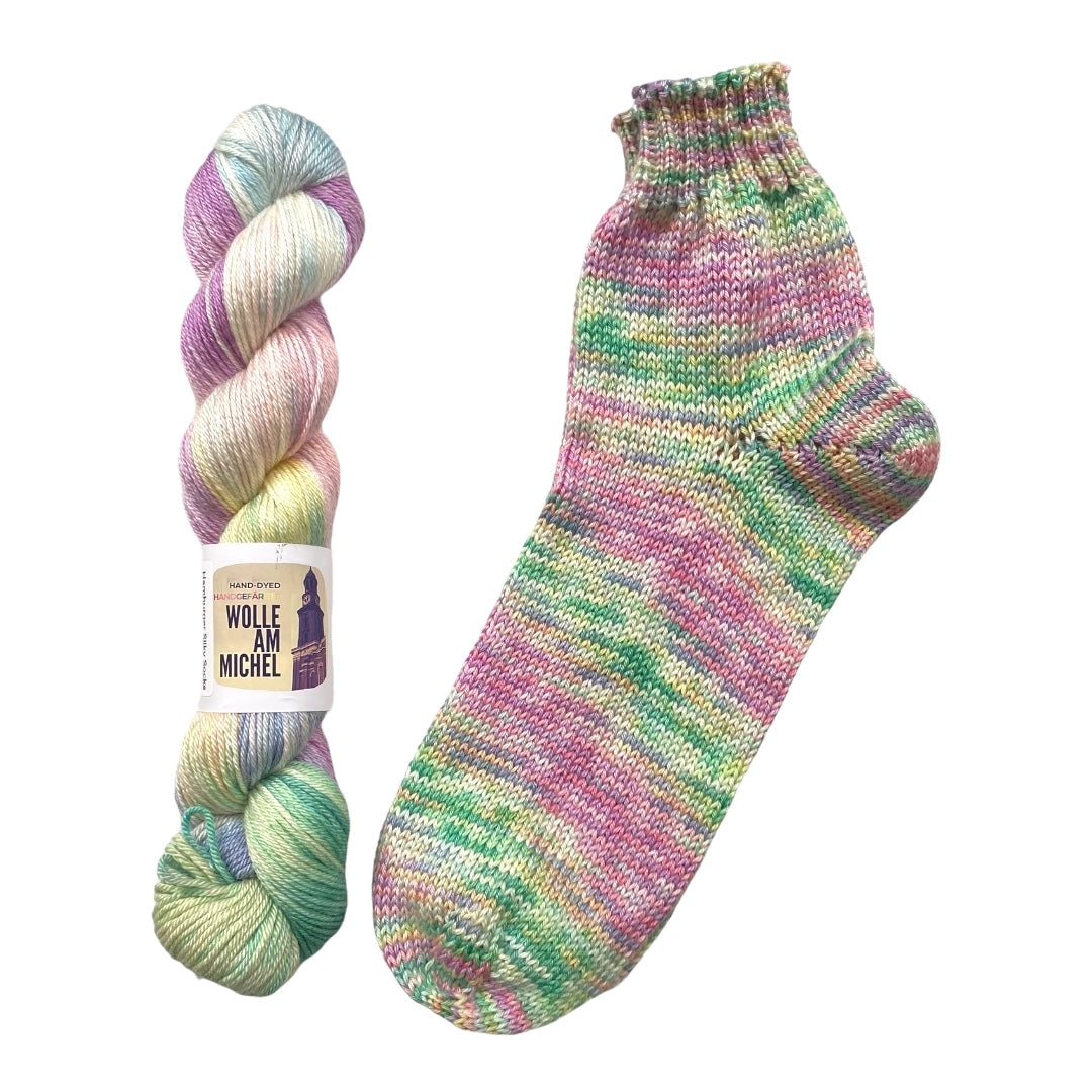 Erleben Sie die luxuriöse Weichheit und den edlen Glanz unseres handgefärbten Garns "Silky Socks." Dieses exquisite Garn wird mit größter Sorgfalt und Liebe zum Detail in unserem Atelier in Hamburg handgefärbt.